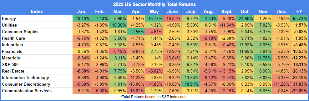 - The energy sector followed up its 55% performance in 2021 with a 65.7% return on the year. It was the best performer by a landslide and one of only two — Utilities — sectors to finish in the green. It’s rare that the best-performing sector repeats two years in a row.