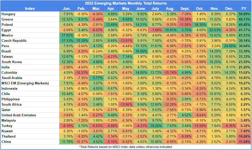 • China’s 11.04% loss is the third year of losses for the market. It lost 21.80% in 2022 and lost 21.64% in 2021. Only one emerging market has experienced four consecutive losing years — Thailand — since 1988.