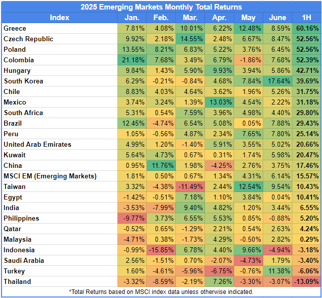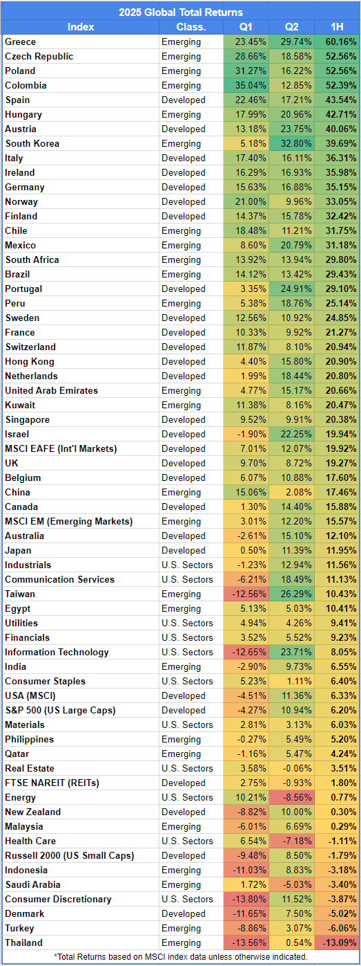 - Greece was the lone market with returns in excess of 20% in both Q1 and Q2 2025.