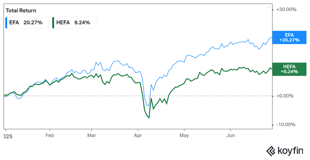 The unhedged (EFA) ETF is up almost exactly 11 percentage points more than the hedged (HEFA) ETF. Currency risk can be a benefit with a diversified portfolio in the short run (European investors, with money in U.S. stocks are experiencing the opposite effect). In the long run, currency risk tends to balance out.