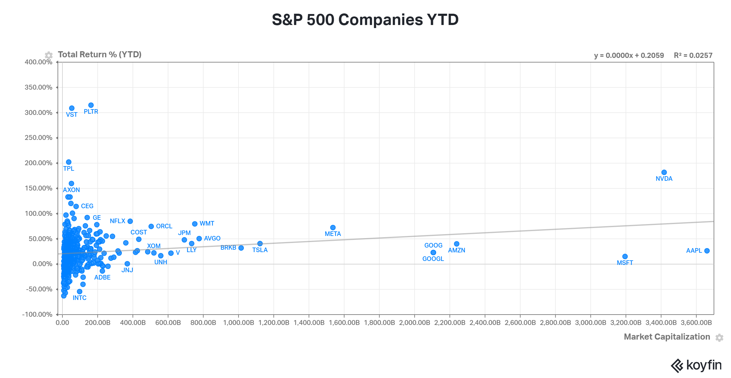 The scatter plot below is another way to look at the performance of S&P 500 companies. The Magnificent Seven stands out – the seven companies on the right side of the chart.