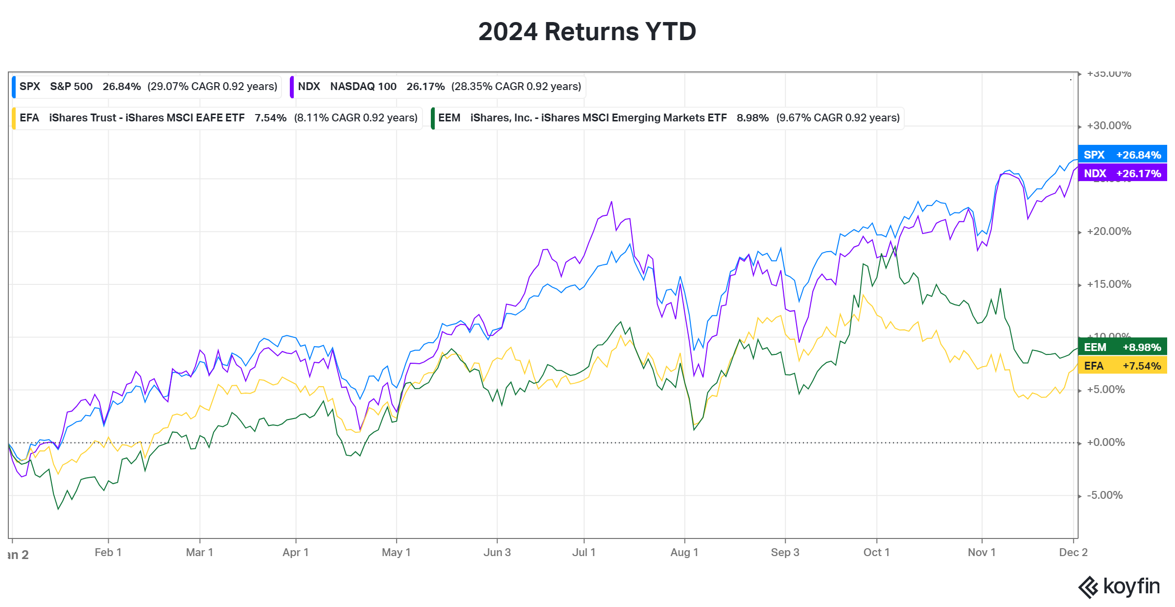 Both the S&P 500 and Nasdaq are up close to 26% year to date. Including dividends adds a couple of percentage points to that. It’s been a phenomenal year for U.S. stocks.