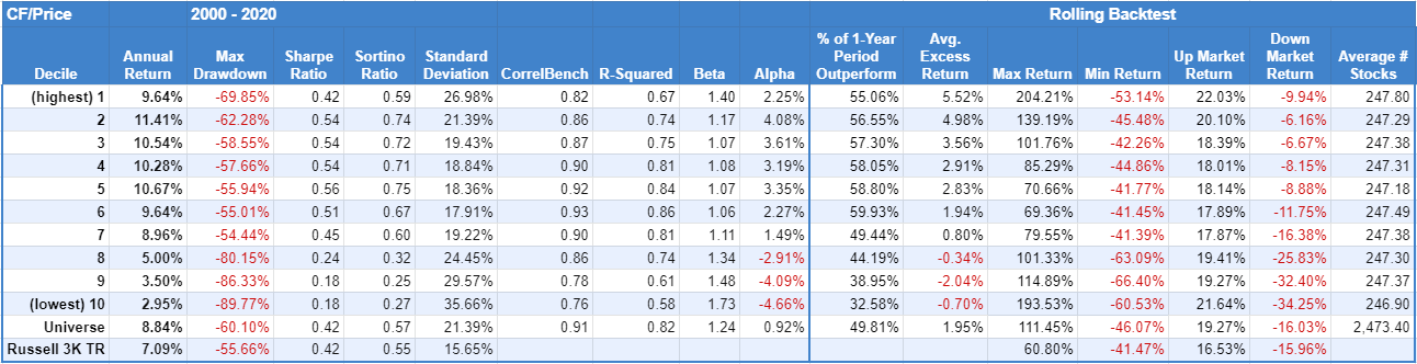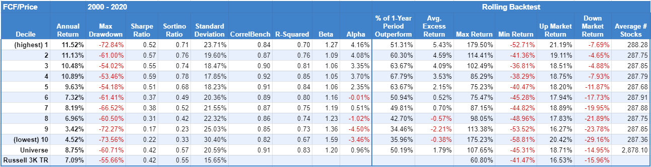 The results clearly show the potential benefit of cheaper companies based on FCF/Price.