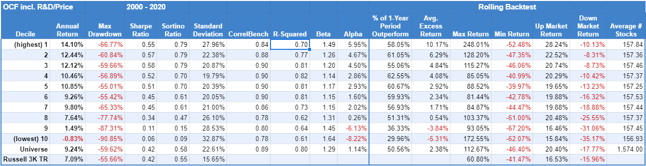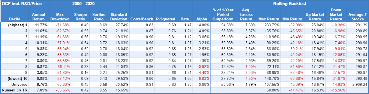 The metric adds R&D expense back to operating cash flow. Though, a significant number of companies don’t spend on R&D, as the next test shows. The results show a slight improvement in returns in the cheapest decile compared to OCF/Price. The biggest difference is on the expensive end, where the most expensive decile performed worse.