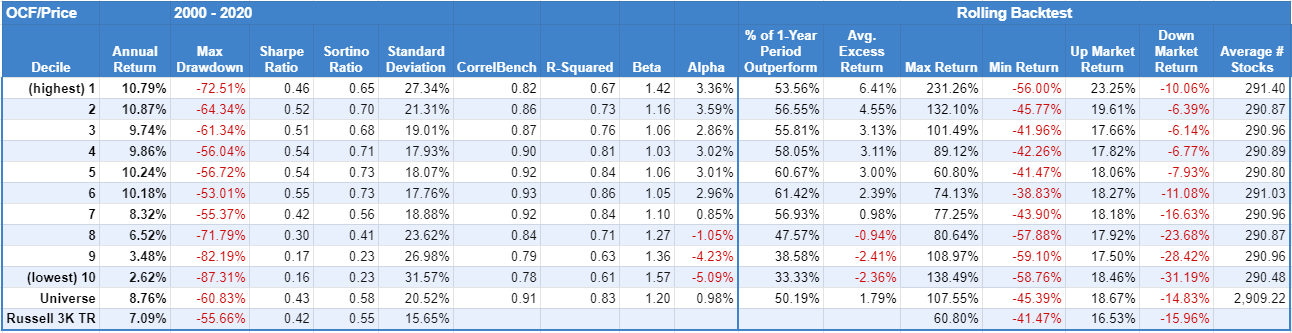 Operating cash flow measures the cash generated from day-to-day business activities. The results show cheapest stocks based on OCF/Price easily outperform the expensive stocks.