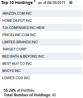 This is a perfect example of a top ten holding that a fund manager really believes in, at 55%. And if you dig a little deeper and look at all the holdings, you’d find that Amazon makes up 14% of the fund, Home Depot is 7% and TJX Companies is at 6% of the fund. Concentrating on these three may be enough to find that quality retail stock.