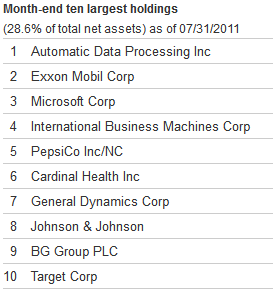 To the left is the top ten holdings in the fund as of 7/31/2011, only a few weeks before this was written. And they represent 28.6% of the fund which isn’t that high but it gives us a good start on where to go next.