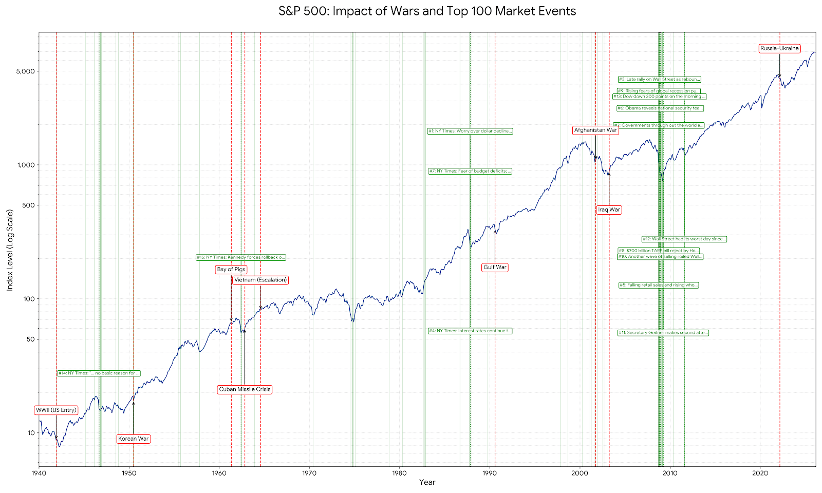 The chart below tells part of the story. It highlights the start of major wars going back to WWII.